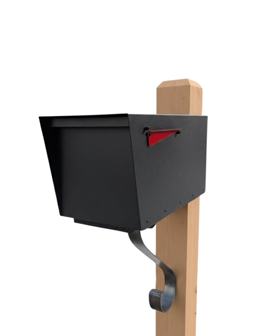 Elevate your entryway with a perfect blend of industrial edge and natural warmth. This premium mailbox set features a heavy-duty, large-capacity modern steel mailbox from Rusty Designs, finished in a sleek matte black. It is anchored by a massive, 6x6 solid wood post with a classic chamfered top. Topped off with a custom-curved steel bracket and a vibrant red flag, it’s a high-end statement piece designed to last a lifetime.